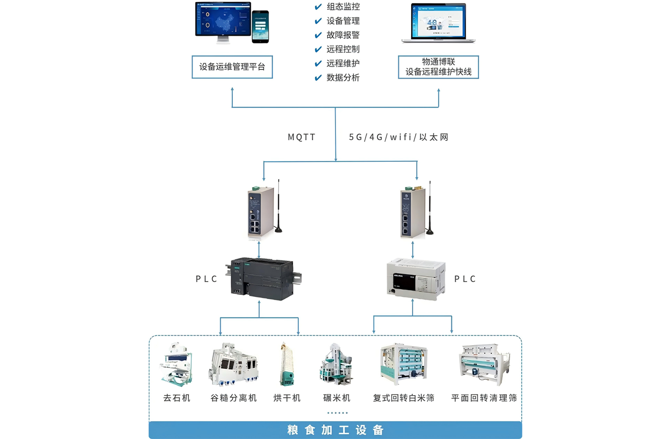 通過網(wǎng)關采集糧油機械設備的PLC,網(wǎng)關具有多種PLC的協(xié)議兼容能,同時支持5G/4G/WIFI/以太網(wǎng)等方式對接到云平臺或上位機中。