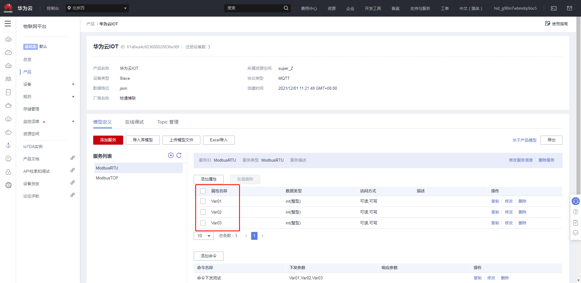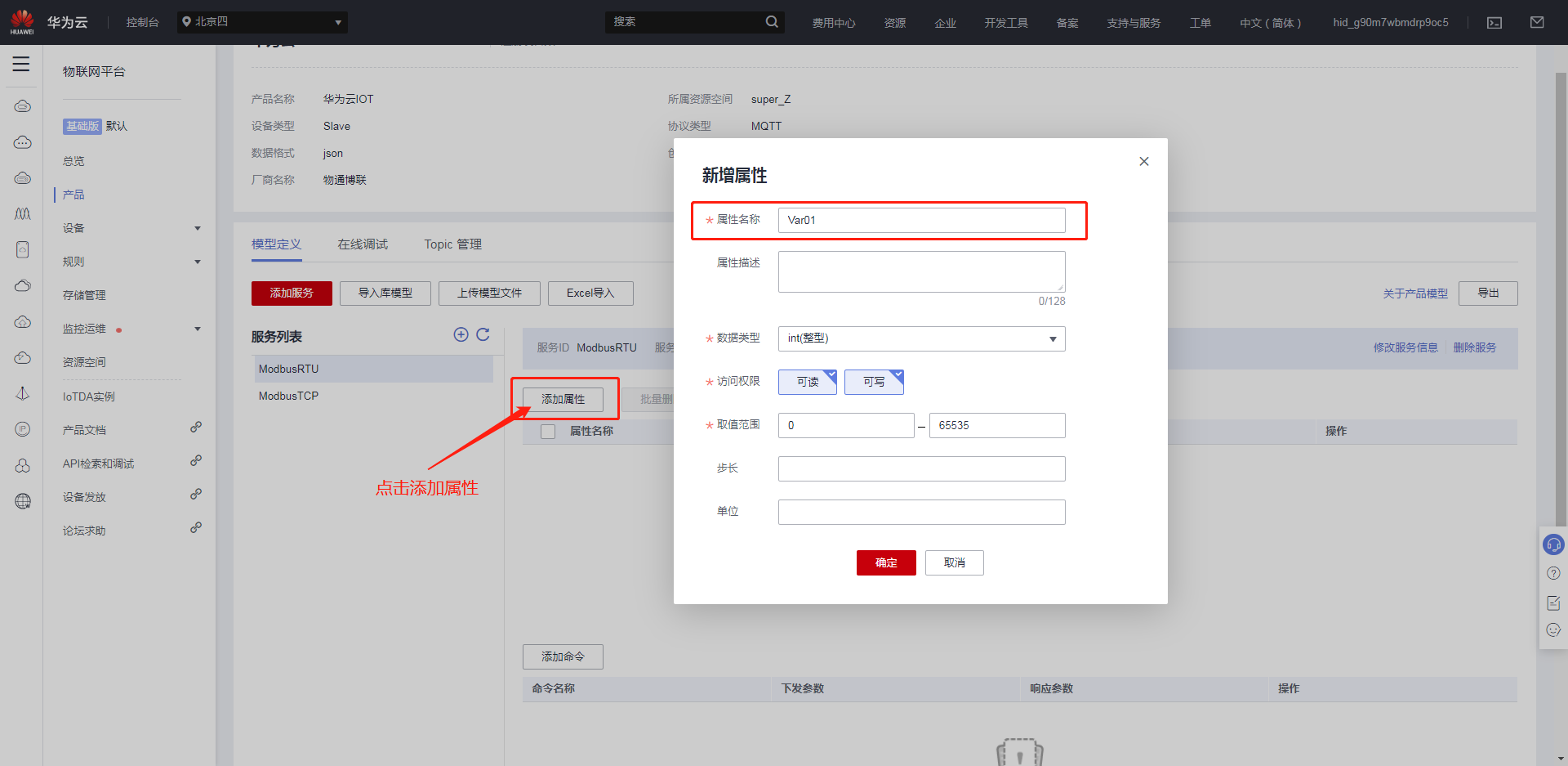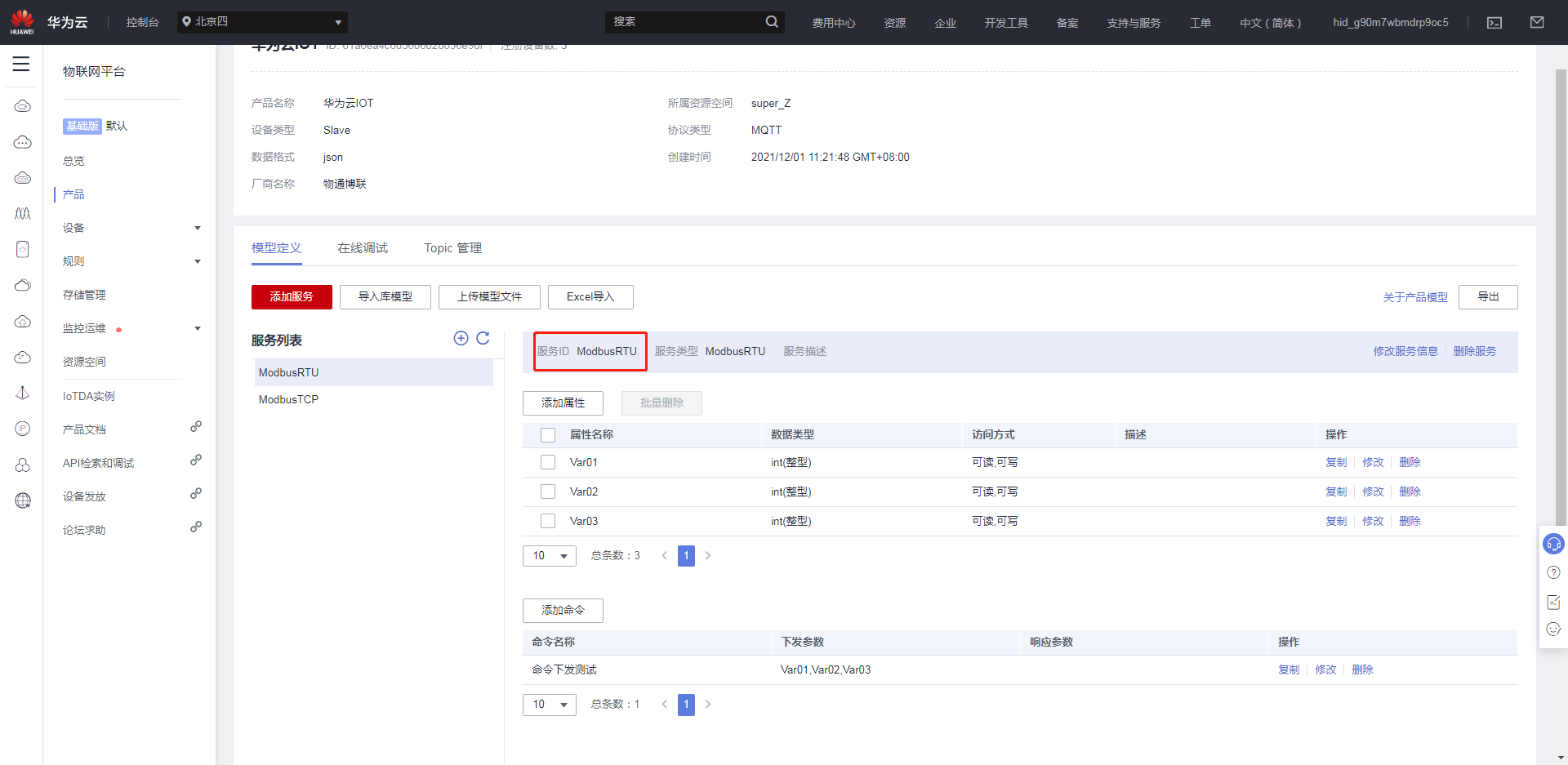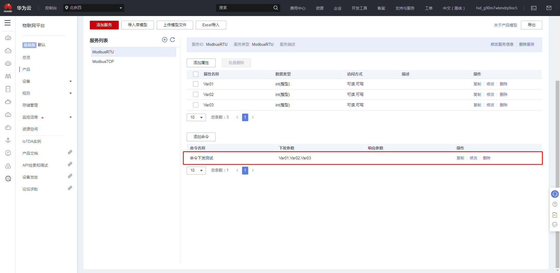 創(chuàng)建完產(chǎn)品后,點(diǎn)擊創(chuàng)建好的產(chǎn)品,進(jìn)入自定義模型界面,點(diǎn)擊自定義模型,創(chuàng)建服務(wù)ID。