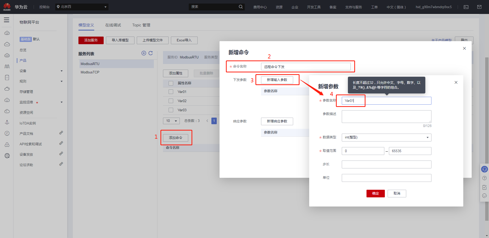 華為云反控設(shè)定:點(diǎn)擊添加命令,定義命令名稱,新增輸入?yún)?shù),建立需要下發(fā)寫的參數(shù),“參數(shù)名稱”要與需要下發(fā)寫的“屬性名稱”對(duì)應(yīng)。