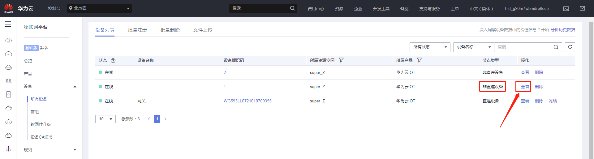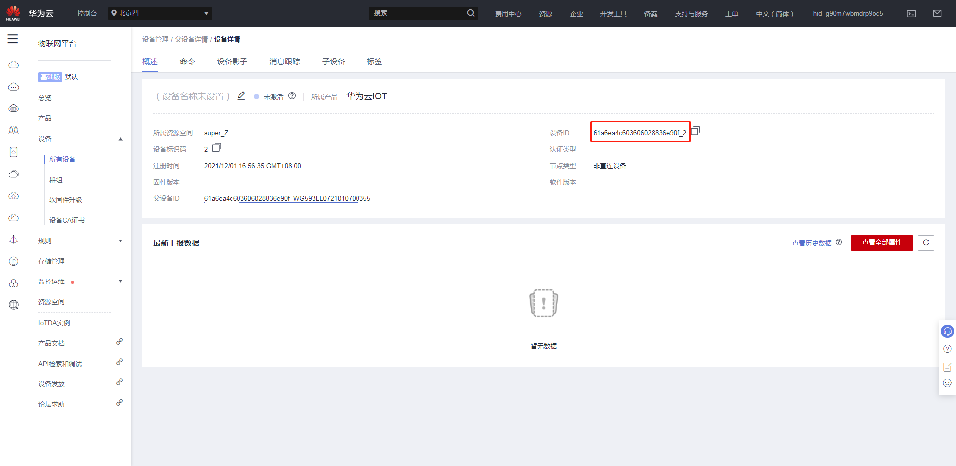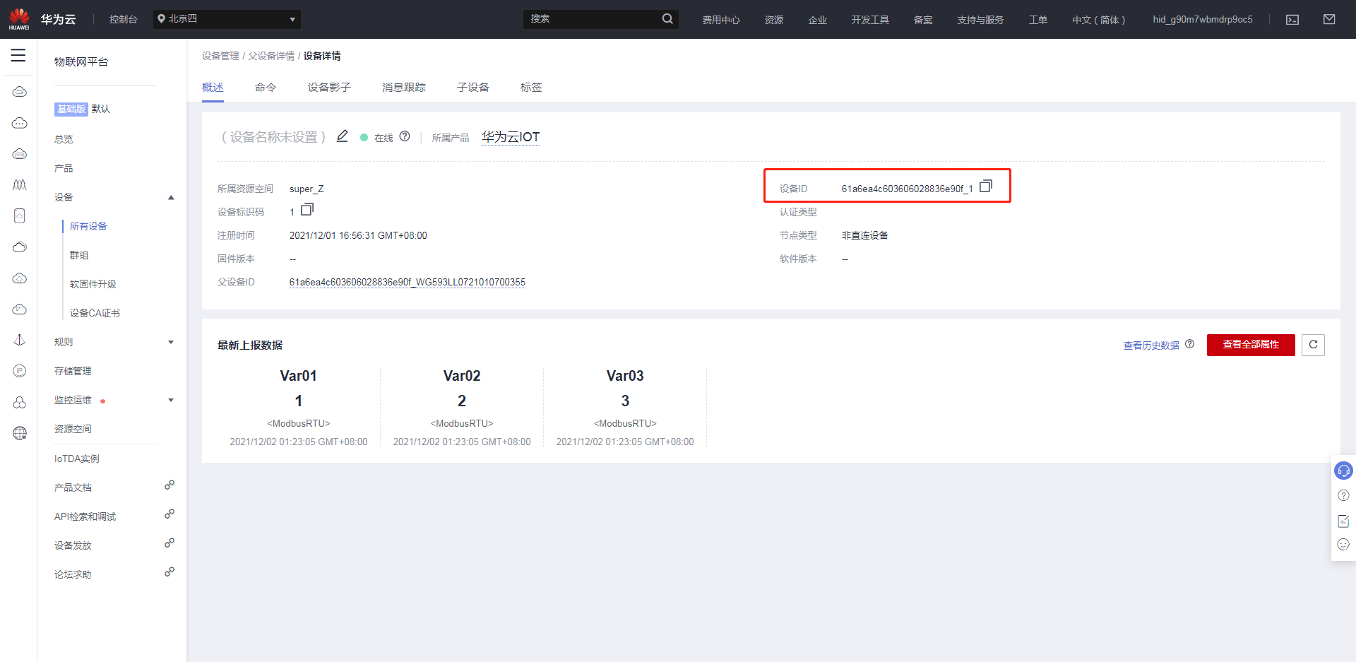網(wǎng)關(guān)端“子設(shè)備序號(hào)”對(duì)應(yīng)華為云IOT非直連設(shè)備的“設(shè)備ID”;