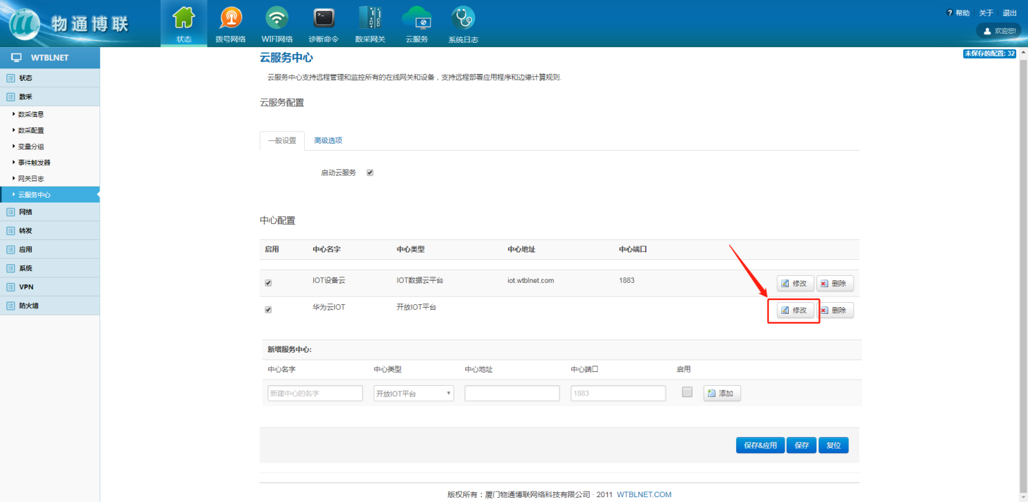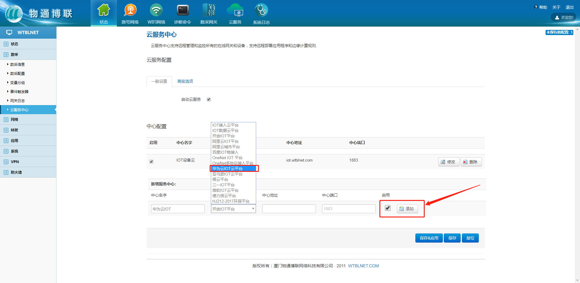 在網(wǎng)關(guān)本地web界面內(nèi),左側(cè)目錄欄中選擇數(shù)采,下拉框中的云服務(wù)中心來(lái)配置網(wǎng)關(guān)與華為云IOT的MQTT連接參數(shù),中心類型選擇華為云IOT平臺(tái),并勾選啟用,點(diǎn)擊添加。