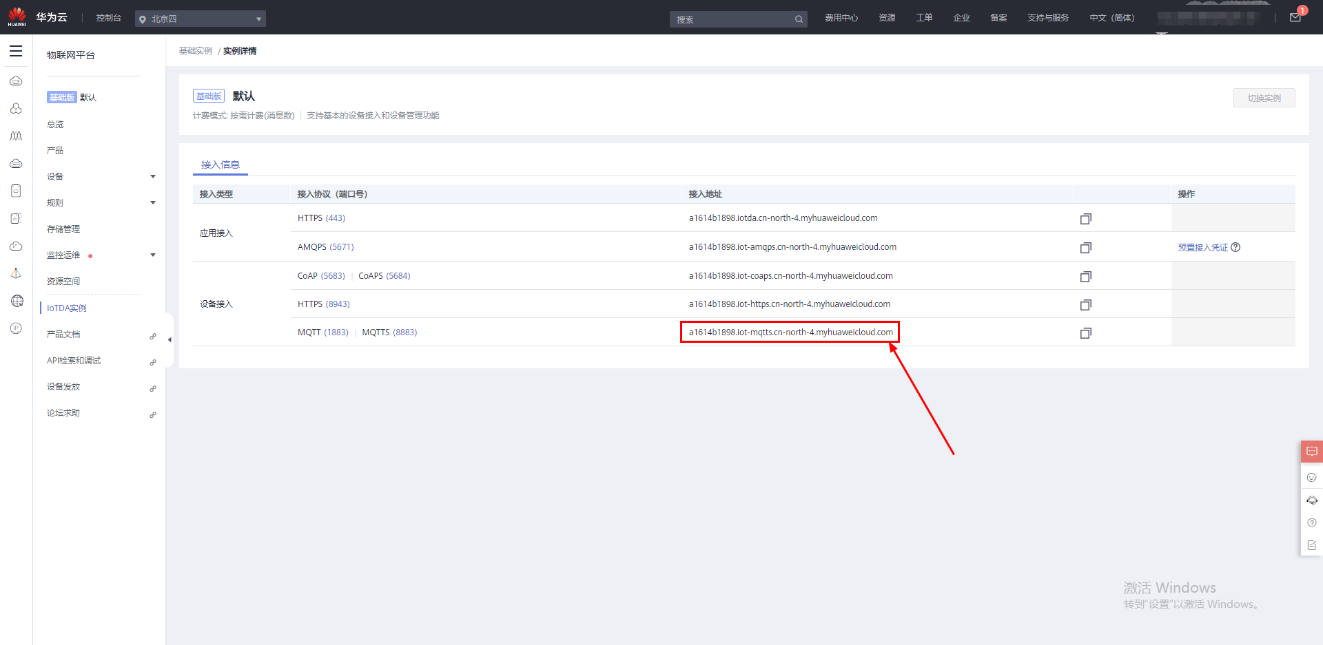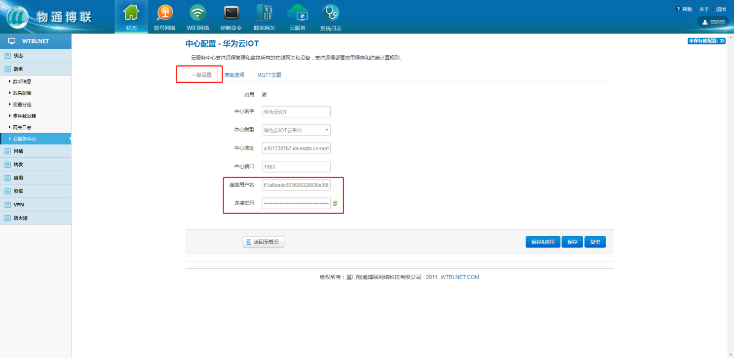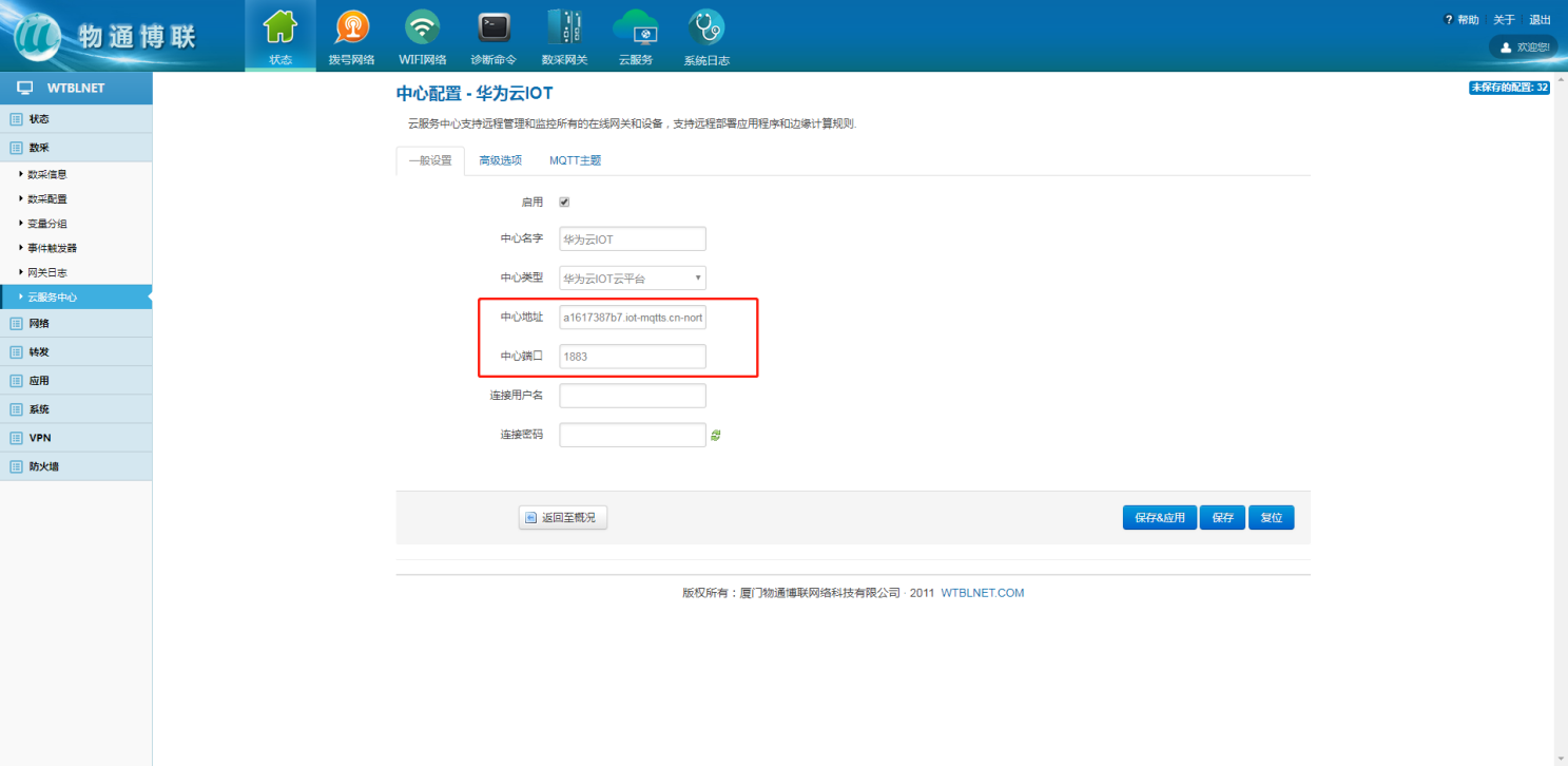 云中心地址在華為云IOT,左側(cè)目錄欄總覽上的平臺(tái)接入地址內(nèi),點(diǎn)擊進(jìn)入,相關(guān)MQTT連接的中心地址以及端口號(hào)復(fù)制到網(wǎng)關(guān)上。