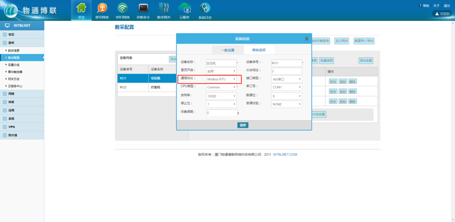 在數(shù)采配置中添加設(shè)備信息,選擇對(duì)應(yīng)采集設(shè)備的協(xié)議及通訊參數(shù);