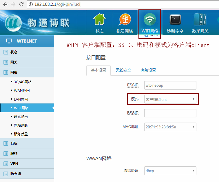 模式:客戶端Client(通過WiFi上外網(wǎng)請選擇client模式,如果是共享WiFi給其他設備請選擇AP模式)