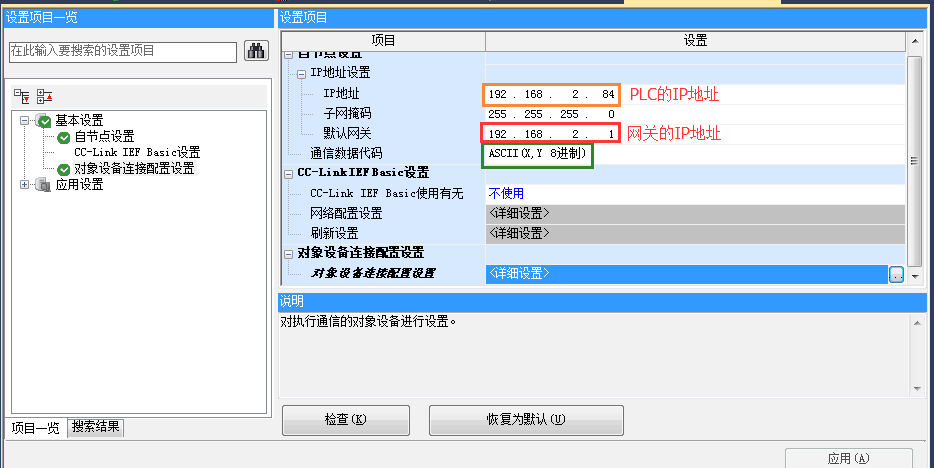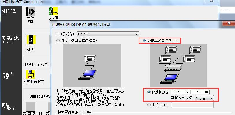 2、“CPU模式”設置,“經(jīng)由集線器連接”,填寫控制器的IP地址。