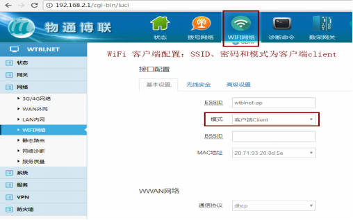 模式:客戶端Client(通過WiFi上外網(wǎng)請選擇client模式,如果是共享WiFi給其他設(shè)備請選擇AP模式)