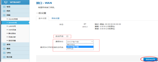 勾選自動開啟,選擇通信協(xié)議(靜態(tài)地址、DHCP客戶端、PPPOE,三選一),保存&應(yīng)用。