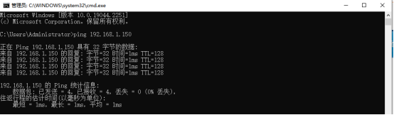 1、將PLC與網(wǎng)關(guān)通過LAN口相連接,通過設(shè)備快線(維護(hù)通道搭建成功后)在遠(yuǎn)程電腦上使用cmdpingPLC的IP地址(192.168.1.150為PLC的IP地址)