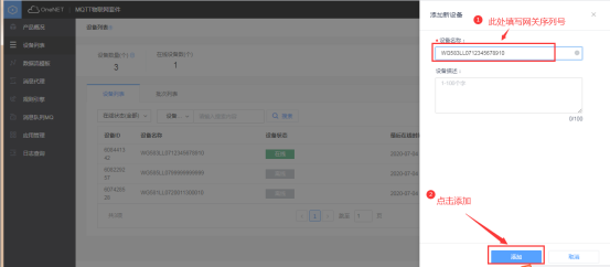 2、平臺上添加網(wǎng)關(設備)