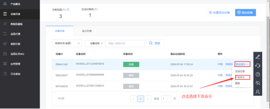 可以在設備列表中選擇對應網(wǎng)關更多操作中的下發(fā)命令