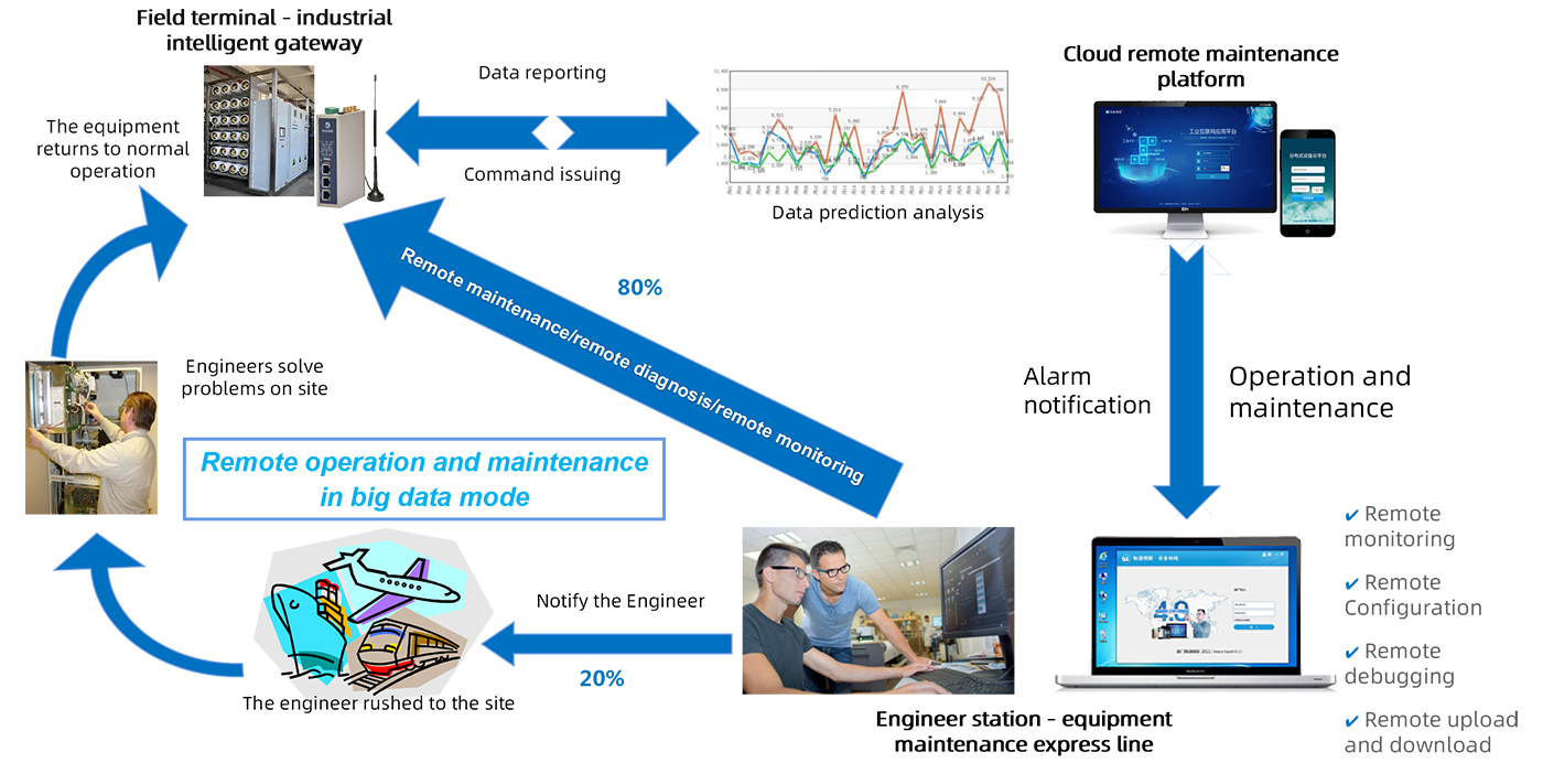 The equipment operation and maintenance platform has the function of alarming equipment abnormality. You can check the alarm and health status of the equipment through the platform. At the same time, you can set up SMS, WeChat and email for alarm notification; engineers perform remote maintenance through work orders, and realize real-time operation and maintenance monitoring through the maintenance screen. .