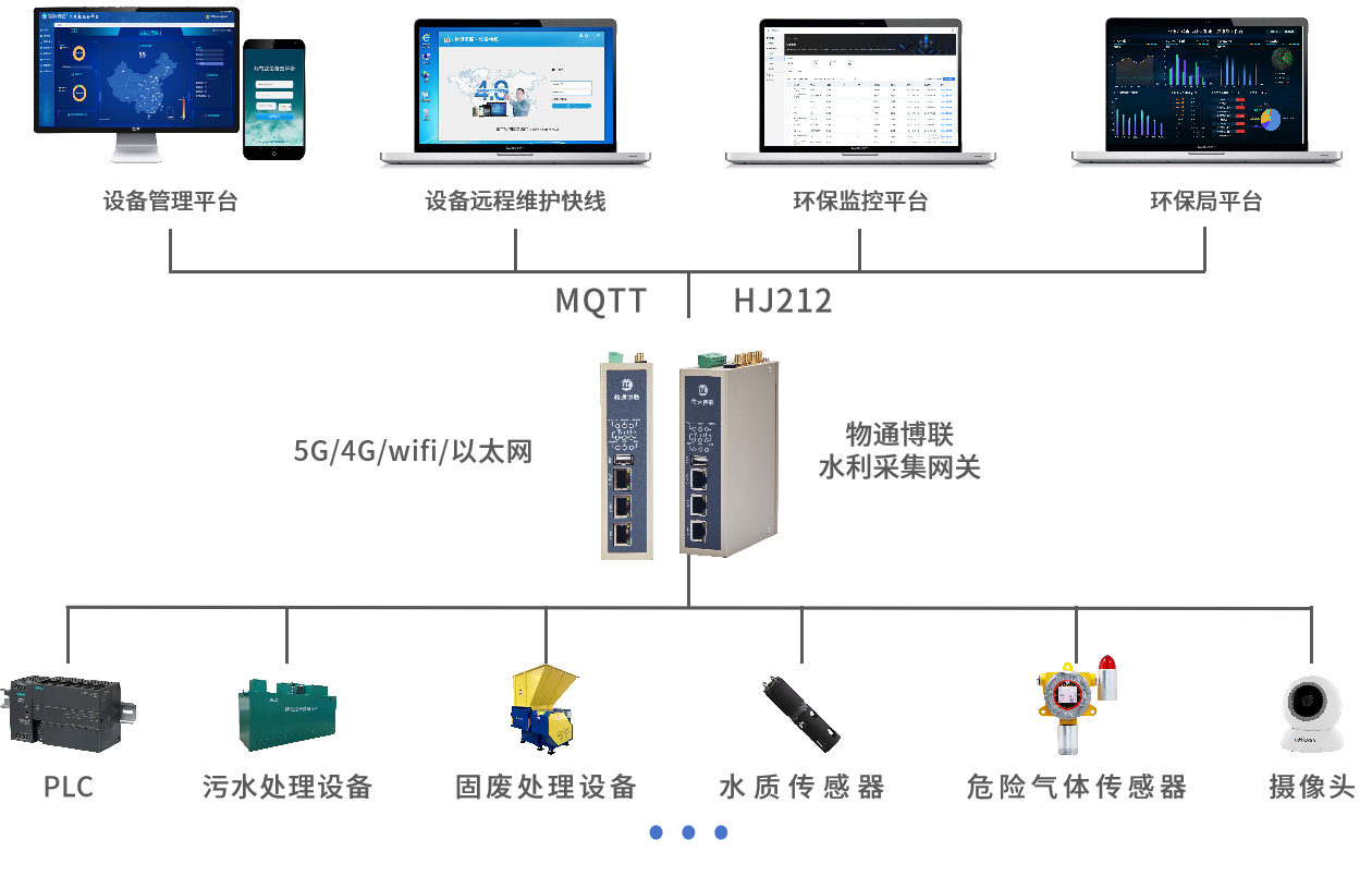 物通博聯(lián)環(huán)保采集網(wǎng)關(guān)可以連接各種環(huán)保設(shè)備、傳感器、儀表、IO數(shù)據(jù)和PLC,通過MQTT協(xié)議上傳到設(shè)備管理平臺和通過HJ212協(xié)議上傳到環(huán)保局監(jiān)控平臺,實現(xiàn)設(shè)備遠程監(jiān)控和數(shù)據(jù)分析,為環(huán)境監(jiān)測和管理提供重要的決策支持。