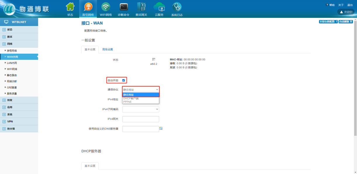 下載中心 視頻中心 常見問題 售后服務(wù) 工業(yè)網(wǎng)關(guān) 設(shè)備快線 數(shù)據(jù)云平臺 聯(lián)網(wǎng)設(shè)備 問答百科 工業(yè)智能網(wǎng)關(guān)如何設(shè)置靜態(tài)固定IP? 時間:2022-10-26 09:15:30 點擊:4989 關(guān)鍵詞:工業(yè)智能網(wǎng)關(guān),靜態(tài)固定IP,網(wǎng)關(guān)配置 問題:工業(yè)智能網(wǎng)關(guān)如何設(shè)置靜態(tài)固定IP? 回答: (1)WAN外網(wǎng)設(shè)置靜態(tài)IP 網(wǎng)絡(luò)—WAN外網(wǎng)—切換通信協(xié)議——填寫固定IP參數(shù) (2)WiFi網(wǎng)絡(luò)設(shè)置靜態(tài)IP 網(wǎng)絡(luò)—WiFi網(wǎng)絡(luò)—修改—切換通信協(xié)議—填寫靜態(tài)IP 上一篇:工業(yè)智能網(wǎng)關(guān)如何使用網(wǎng)線上網(wǎng)? 下一篇: 工業(yè)智能網(wǎng)關(guān)如何進行軟硬件復(fù)位?
