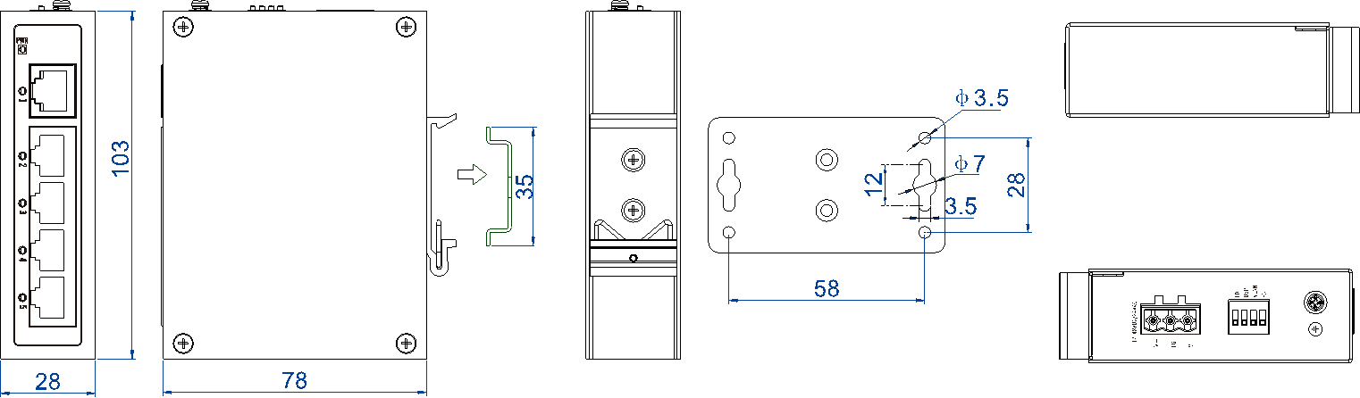 外殼:IP40防護(hù)等級(jí),金屬外殼 安裝:DIN導(dǎo)軌式或壁掛式安裝 尺寸(寬×高×深):28mm×103mm×78mm |