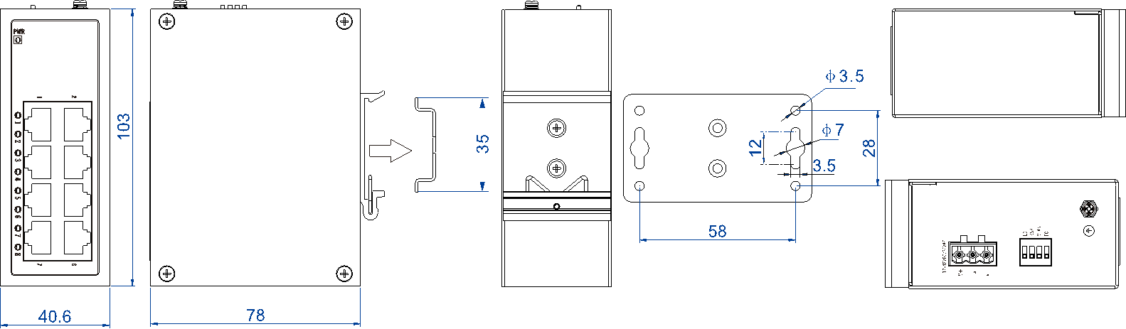 外殼:IP40防護(hù)等級,金屬外殼 安裝:DIN導(dǎo)軌式或壁掛式安裝 尺寸(寬×高×深):40.6mm×103mm×78mm |
