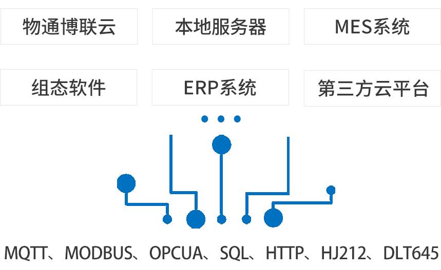 北向支持接入物通博聯(lián)云平臺(tái),客戶(hù)自主開(kāi)發(fā)的云平臺(tái),第三方云平臺(tái)(根云、美云、華為、阿里、百度、微軟等IOT云平臺(tái)),組態(tài)軟件、MES系統(tǒng)、行業(yè)監(jiān)控平臺(tái)等工業(yè)軟件