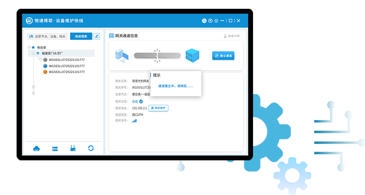 使用物通博聯(lián)的設(shè)備維護(hù)快線,通過賬號(hào)登錄后,找到相應(yīng)網(wǎng)關(guān)建立維護(hù)通道,就可以搭建通往設(shè)備現(xiàn)場(chǎng)的網(wǎng)口通道和串口通道,讓工程師不用遠(yuǎn)程出差就可以像到現(xiàn)場(chǎng)一樣,實(shí)現(xiàn)隨時(shí)隨地遠(yuǎn)程維護(hù)。