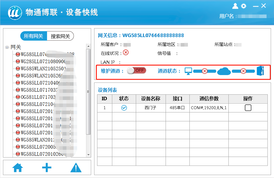 選擇選擇一臺需要維護的在線網(wǎng)關(guān),點擊建立通道,等到通道狀態(tài)都是綠色打鉤后就證明通道建立完成,以太網(wǎng)設(shè)備可以通過ping來測試通道情況。