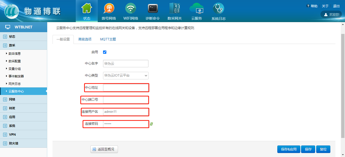 工業(yè)網(wǎng)關(guān)配置界面,填寫相關(guān)連接參數(shù),配置內(nèi)容,即可將數(shù)據(jù)上傳至華為云IOT設(shè)備接入模型中(每種不同的第三方接入云,都有詳細的配置手冊)