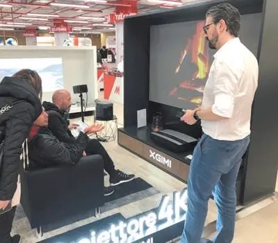 消費(fèi)者在極米科技位于意大利米蘭一家電器商場(chǎng)的快閃店體驗(yàn)投影儀產(chǎn)品。 鄒 成攝