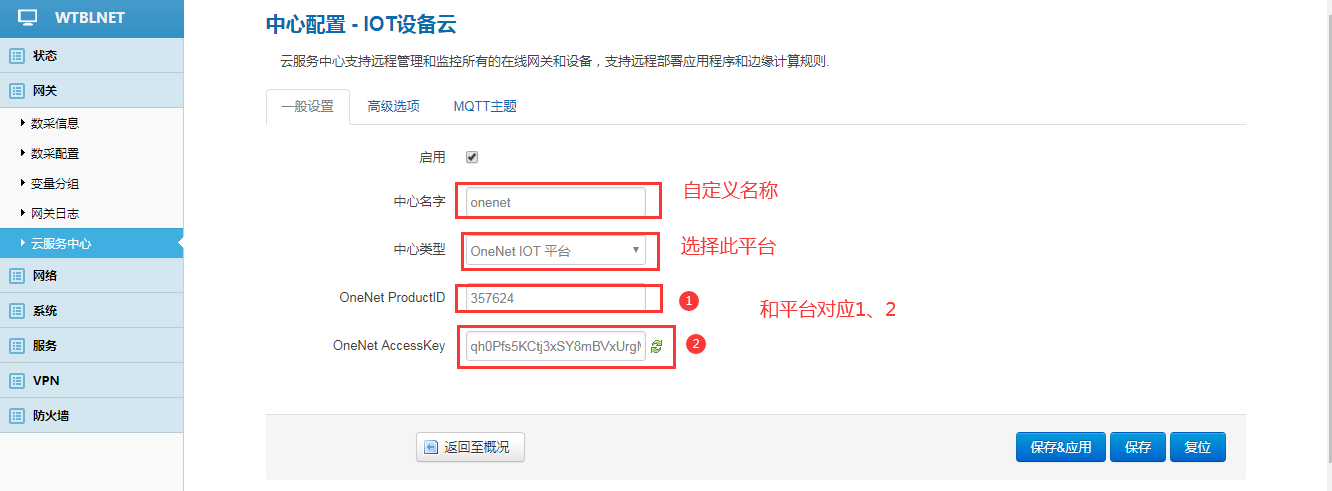 3、在網(wǎng)關(guān)配置“云服務(wù)地址”添加onenet平臺(tái)(物通博聯(lián)