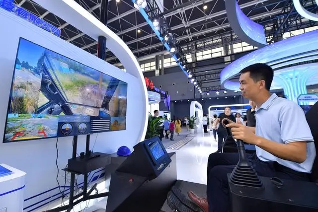 9月7日,參觀者在本屆數(shù)博會上體驗挖掘機5G遠(yuǎn)程駕駛系統(tǒng)。新華社記者 駱學(xué)峰 攝