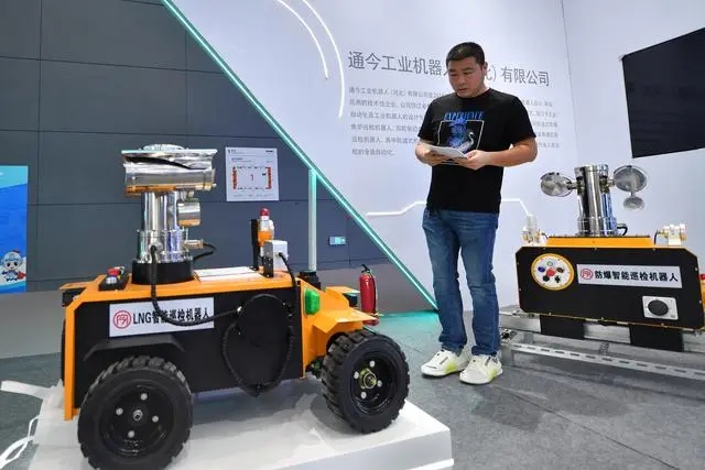 9月7日,參觀者在本屆數(shù)博會上參觀LNG智能巡檢機器人。新華社記者 駱學(xué)峰 攝