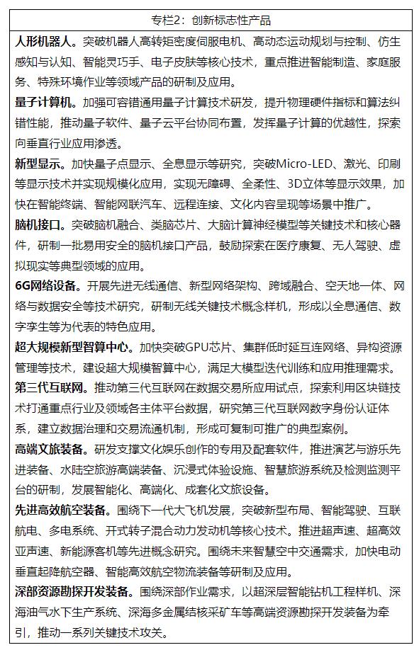 6.做強未來高端裝備。面向國家重大戰(zhàn)略需求和人民美好生活需要,加快實施重大技術(shù)裝備攻關(guān)工程,突破人形機器人、量子計算機、超高速列車、下一代大飛機、綠色智能船舶、無人船艇等高端裝備產(chǎn)品,以整機帶動新技術(shù)產(chǎn)業(yè)化落地,打造全球領(lǐng)先的高端裝備體系。深入實施產(chǎn)業(yè)基礎(chǔ)再造工程,補齊基礎(chǔ)元器件、基礎(chǔ)零部件、基礎(chǔ)材料、基礎(chǔ)工藝和基礎(chǔ)軟件等短板,夯實未來產(chǎn)業(yè)發(fā)展根基。