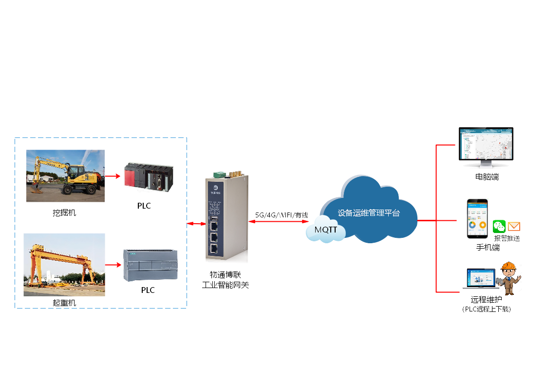 對此,物通博聯(lián)提供高效可靠的工程機(jī)械物聯(lián)網(wǎng)遠(yuǎn)程監(jiān)控運維系統(tǒng)解決方案。通過將工業(yè)智能網(wǎng)關(guān)部署到工程機(jī)械內(nèi),接入各類PLC和傳感器設(shè)備,采集諸如設(shè)備位置、工作狀態(tài)、運行時間等關(guān)鍵數(shù)據(jù),并利用4G/5G等通訊技術(shù)將數(shù)據(jù)實時傳輸至云端服務(wù)器進(jìn)行分析處理。