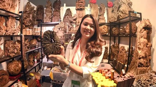 9月24日,在南寧國際會展中心越南館,一名參展商在推銷沉香木。新華社記者 張愛林 攝