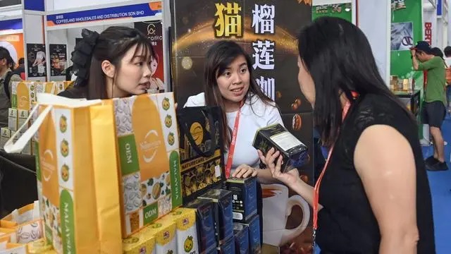 9月24日,在南寧國際會展中心馬來西亞館,一名女士在選購榴蓮咖啡。