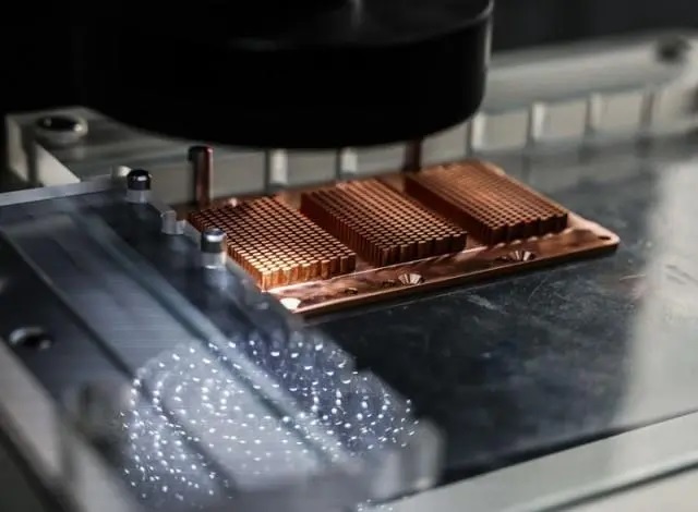 2024年4月16日,在位于諸暨市的海特信科新材料科技有限公司檢測實驗室內(nèi),工作人員在檢測用于新能源汽車的針式散熱銅基板。新華社記者 徐昱 攝