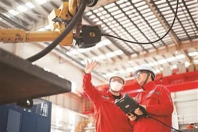 10月30日,工作人員在海油工程天津智能制造基地制管作業(yè)車間調(diào)試一款焊接機(jī)器人。新華社記者 趙子碩 攝
