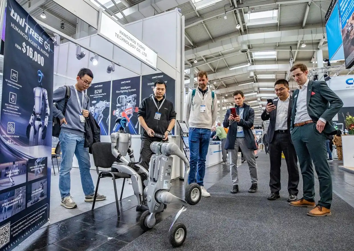 德國漢諾威工業(yè)博覽會展館內(nèi),人潮涌動,一只四足機器狗疾馳而過,流線型金屬機身靈活擺動。它精準(zhǔn)避開人群,偶爾停下,微微擺動腦袋,仿佛在觀察周圍環(huán)境。身后,觀眾紛紛小跑追趕,舉著手機拍攝記錄。這只機器狗最終停在一家中國企業(yè)展臺前,展臺旁還坐著一個人形機器人,科技感撲面而來。