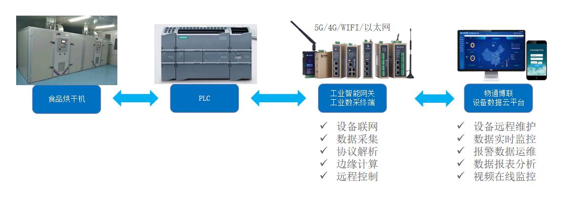 為解決這些問題,物通博聯(lián)提供以工業(yè)智能網(wǎng)關為中心構建的糧食烘干機遠程監(jiān)控智能管理系統(tǒng)。通過將糧食烘干機的控制器PLC接入網(wǎng)關,實時采集設備運行狀態(tài)、工藝參數(shù)、報警信息等數(shù)據(jù)。這些數(shù)據(jù)經(jīng)由5G/4G/WIFI/以太網(wǎng)等通信方式上傳至設備運維管理平臺,實現(xiàn)對糧食烘干機的遠程集中監(jiān)控與智能化管理。