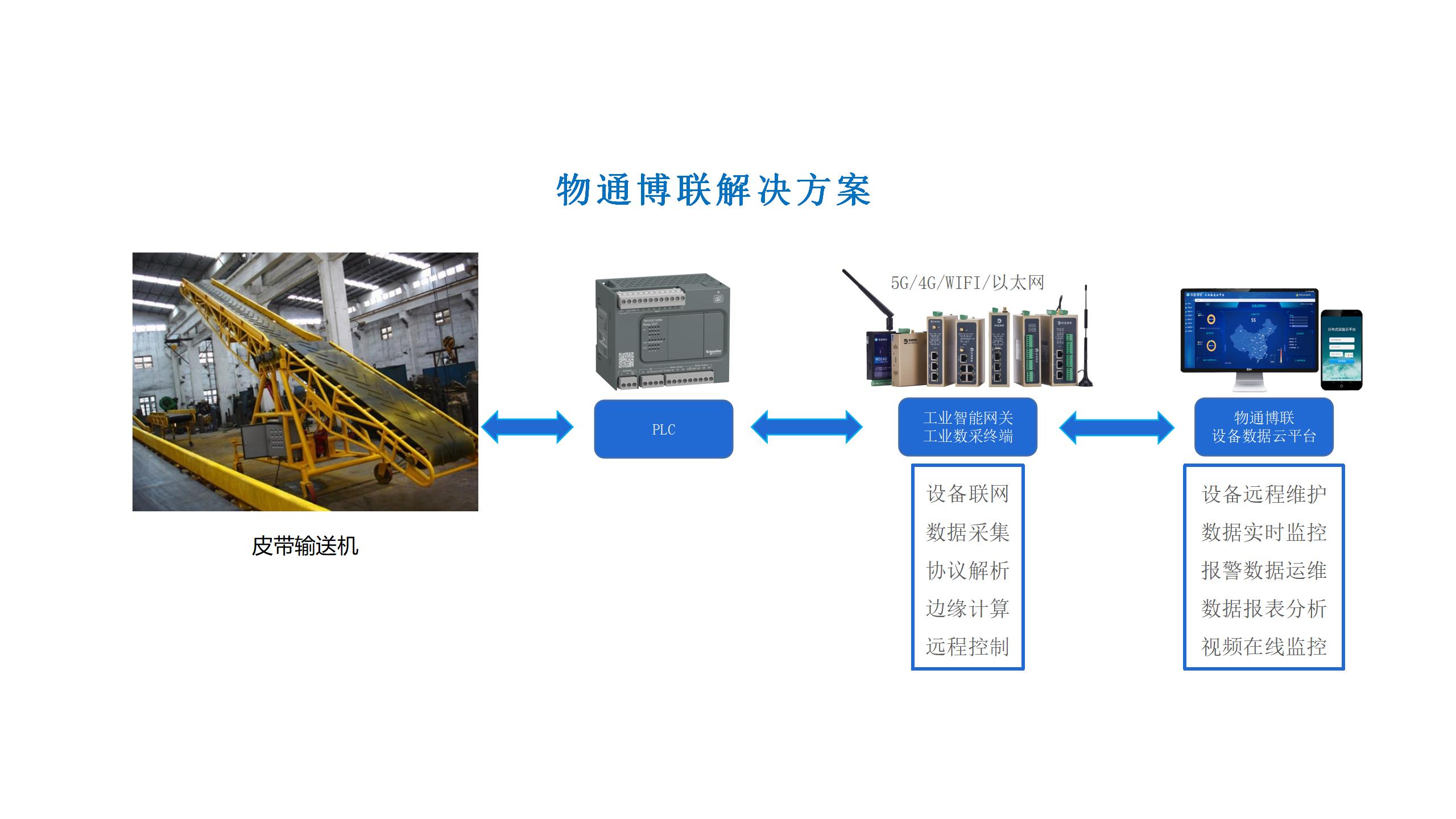 通過接入控制器PLC及告警燈,工業(yè)無線數(shù)采網(wǎng)關實時采集設備開關、電壓電流、是否告警等信息,并通過5G/4G等方式對接到監(jiān)控中心平臺中,從而遠程監(jiān)控全廠各處皮帶輸送機的告警狀態(tài),并在出現(xiàn)異常時進行遠程控制啟停設備,避免出現(xiàn)意外事故。