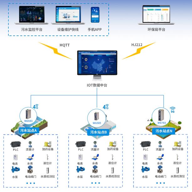 基于日常巡檢與遠(yuǎn)程維護(hù)的需求,物通博聯(lián)提供基于工業(yè)智能網(wǎng)關(guān)的解決方案。通過將污水處理PLC、DLT智能電表、智能攝像頭等設(shè)備接入到網(wǎng)關(guān),網(wǎng)關(guān)能夠?qū)崟r(shí)采集污水處理工藝參數(shù)、能耗以及實(shí)時(shí)視頻等數(shù)據(jù),并通過4G網(wǎng)絡(luò)和MQTT協(xié)議對(duì)接到集團(tuán)運(yùn)維管理平臺(tái)中,從而實(shí)現(xiàn)遠(yuǎn)程監(jiān)控、遠(yuǎn)程控制、遠(yuǎn)程抓拍、遠(yuǎn)程維護(hù)等功能,從而實(shí)現(xiàn)智慧運(yùn)維管理,促進(jìn)降本增效目標(biāo)的實(shí)現(xiàn)。