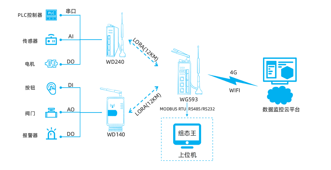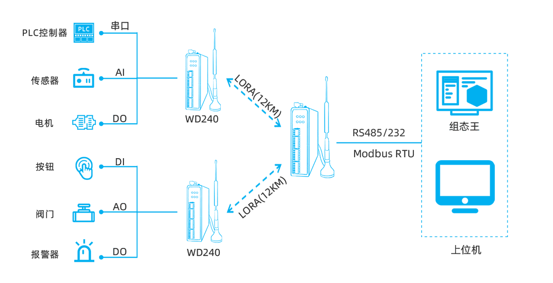 | 示例 | WD240-LM0844-485(8AI-4DI-4DO,國(guó)內(nèi)頻段:410~493MHz,485串口) WD240-LM0484-232(4DI-4AI-4DI-4RO,國(guó)內(nèi)頻段:410~493MHz,232串口) WD240-LM0448-485(4DO-4AI-4DI-4RO,國(guó)內(nèi)頻段:410~493MHz,485串口) WD240-LM2644-232(2AO-6AI-4DI-4RO,國(guó)內(nèi)頻段:410~493MHz,232串口) WD240-LM0844-485(8AI-4DI-4DO,海外頻段:850~930MHz,485串口) WD240-GM0844-485(8AI-4DI-4DO,4G CAT1,485串口)等 |