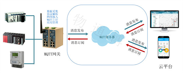 物通博聯(lián)MQTT網(wǎng)關(guān)主動(dòng)采集設(shè)備數(shù)據(jù),并進(jìn)行協(xié)議解析,解析后數(shù)據(jù)經(jīng)過(guò)標(biāo)準(zhǔn)化后,用MQTT協(xié)議作為上行鏈路接入?yún)f(xié)議,通過(guò)消息發(fā)布服務(wù)器上的相應(yīng)主題上,用戶(hù)自主開(kāi)發(fā)的軟件系統(tǒng)/云平臺(tái)通過(guò)訂閱消息該主題而獲取數(shù)據(jù)。當(dāng)軟件系統(tǒng)/云平臺(tái)要向設(shè)備發(fā)送指令或者寫(xiě)入數(shù)據(jù),應(yīng)用軟件系統(tǒng)/云平臺(tái)就發(fā)布一條消息到相應(yīng)的網(wǎng)關(guān)上,然后網(wǎng)關(guān)在把數(shù)據(jù)傳送給設(shè)備;從而實(shí)現(xiàn)軟件系統(tǒng)/云平臺(tái)和現(xiàn)場(chǎng)設(shè)備的數(shù)據(jù)上報(bào)和控制。