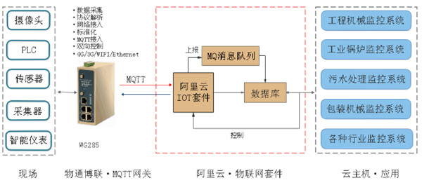 (三)用戶(hù)采購(gòu)物通博聯(lián)MQTT網(wǎng)關(guān)網(wǎng)關(guān)對(duì)數(shù)據(jù)進(jìn)行標(biāo)準(zhǔn)化處理后用MQTT的方式接入到阿里云物聯(lián)網(wǎng)套件中,用戶(hù)購(gòu)買(mǎi)云主機(jī)開(kāi)發(fā)自己的云平臺(tái)。