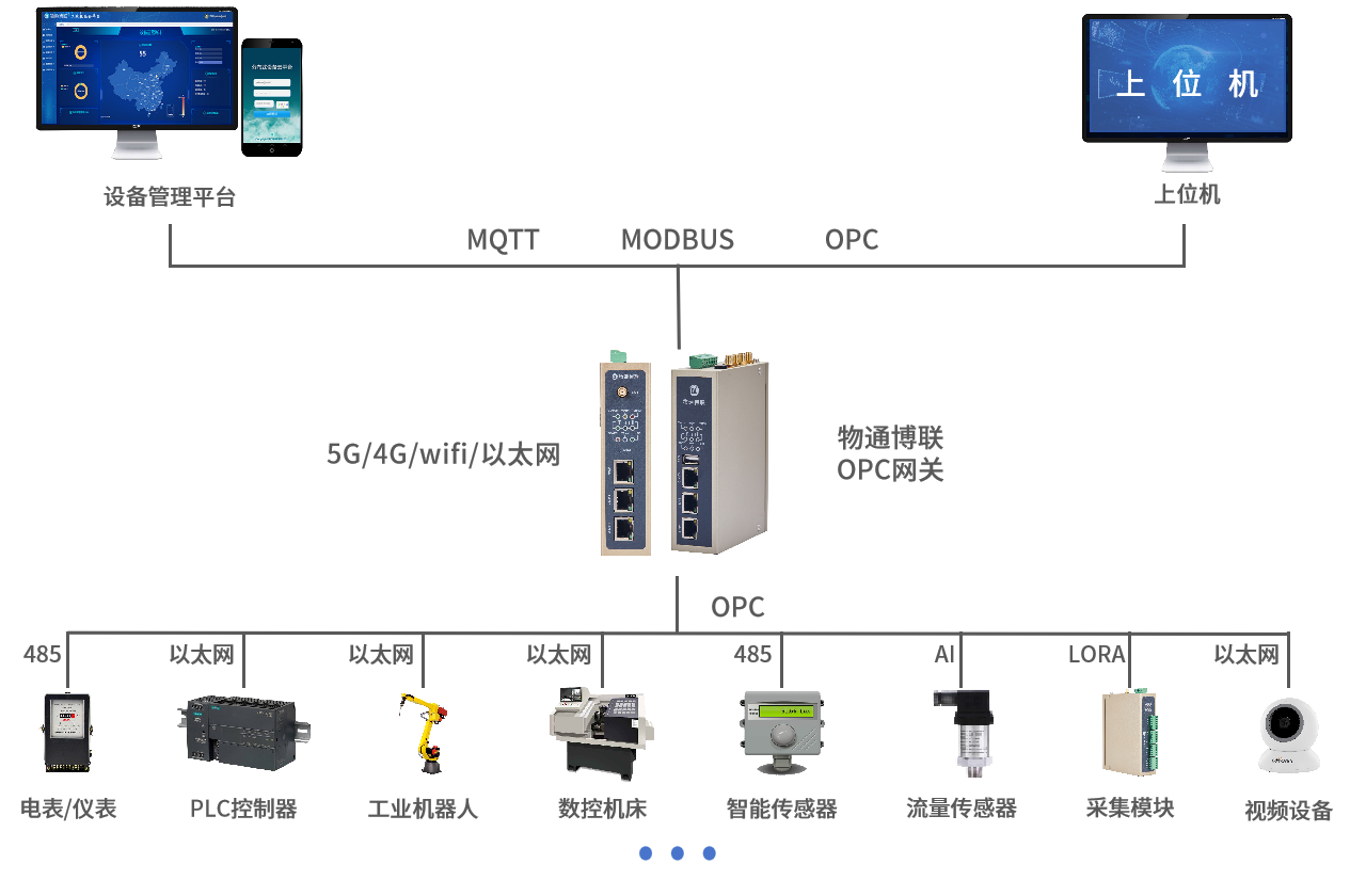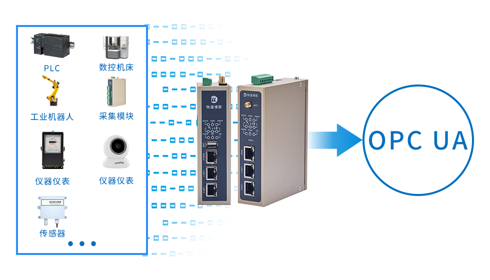 物通博聯(lián)OPC網(wǎng)關(guān)具有設(shè)備聯(lián)網(wǎng)、數(shù)據(jù)采集、協(xié)議解析、邊緣計算、云端接入等功能,支持OPC UA協(xié)議解析數(shù)據(jù)采集,能夠連接到PLC、儀器儀表、傳感器、數(shù)控機床、DCS、SCADA等,實時采集數(shù)據(jù)并通過Modbus/MQTT協(xié)議傳輸?shù)皆破脚_或本地上位機,支持采集設(shè)備數(shù)據(jù)通過OPC UA協(xié)議轉(zhuǎn)發(fā)給組態(tài)軟件、上位機軟件、云平臺,實現(xiàn)設(shè)備遠(yuǎn)程監(jiān)控、遠(yuǎn)程管理。