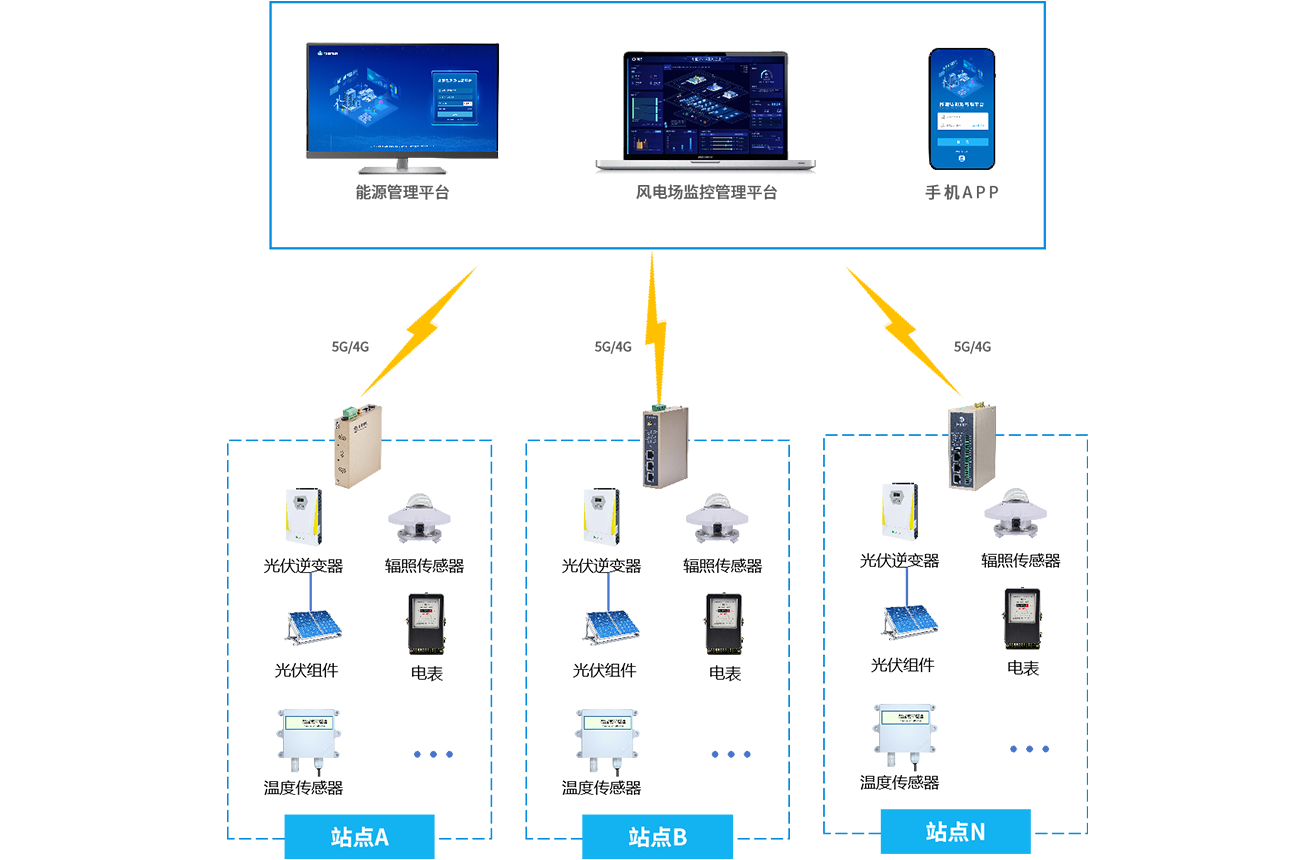 分布式光伏電站通過物通博聯(lián)的工業(yè)通信網(wǎng)關(guān)將采集到的光伏數(shù)據(jù)(如發(fā)電量、設(shè)備溫度、輻照強度等)傳輸至光伏監(jiān)控管理平臺。平臺對數(shù)據(jù)進行分析,實時評估發(fā)電效率,監(jiān)測設(shè)備狀態(tài),當(dāng)出現(xiàn)故障時及時預(yù)警并提供故障診斷和處理建議,同時支持遠程運維操作和能源優(yōu)化調(diào)度。