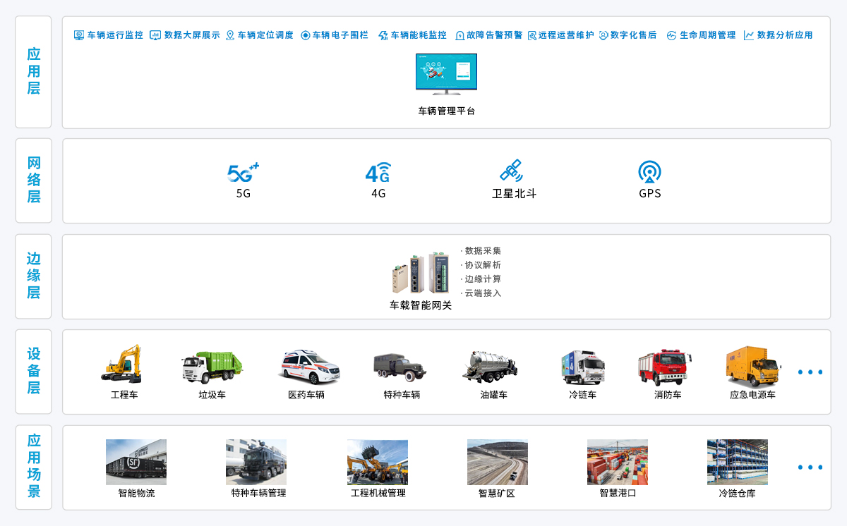 物通博聯(lián)針對特種車輛數(shù)字化需求,以車載智能網(wǎng)關(guān)為核心,實時采集車輛行駛參數(shù)、動力系統(tǒng)狀態(tài)、作業(yè)設(shè)備工況等關(guān)鍵數(shù)據(jù),通過邊緣側(cè)本地化計算完成數(shù)據(jù)清洗、格式標(biāo)準化處理。再依托 5G/4G 無線通信或北斗網(wǎng)絡(luò),將標(biāo)準化數(shù)據(jù)上傳至特種車輛管理平臺。平臺實現(xiàn)車輛位置實時追蹤、運行狀態(tài)遠程監(jiān)控、異常情況及時預(yù)警,為特種車輛高效調(diào)度與安全管理提供技術(shù)支撐。