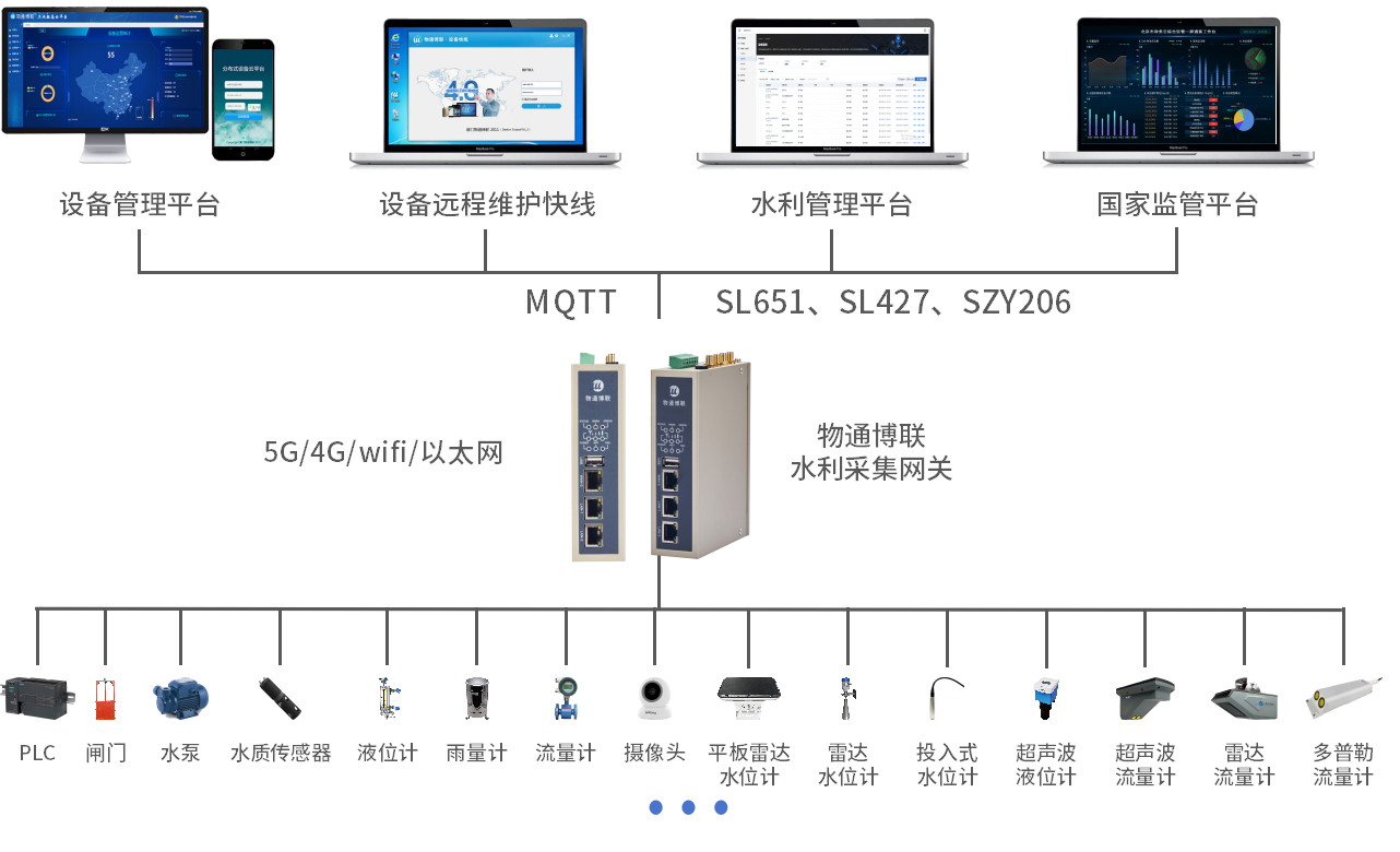 物通博聯(lián)水利采集網(wǎng)關支持水利行業(yè)標準,符合《水文監(jiān)測數(shù)據(jù)通信規(guī)約》、《水資源監(jiān)測數(shù)據(jù)傳輸規(guī)約》,可以連接各種水利設備、傳感器、儀表、IO數(shù)據(jù)和PLC,采集水位、流量、水質(zhì)、氣體、泵站運行狀態(tài)等參數(shù)數(shù)據(jù)通過MQTT協(xié)議上傳到設備管理平臺和通過SL651、SZY206、SL427協(xié)議等上傳到水利監(jiān)管平臺,實現(xiàn)對水利系統(tǒng)運行情況的全面掌握。