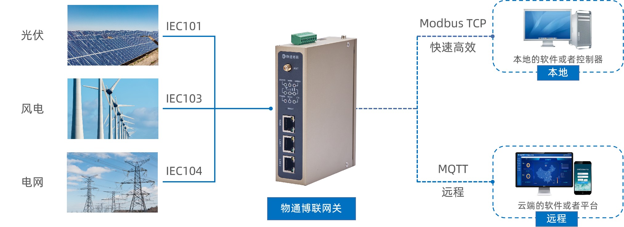 物通博聯(lián)5G工業(yè)智能網(wǎng)關(guān)適用于各種無人值守的輸配電項目,工業(yè)級硬件選型,配合協(xié)議轉(zhuǎn)換功能,數(shù)據(jù)轉(zhuǎn)發(fā)功能,發(fā)揮產(chǎn)品優(yōu)勢保障光伏風(fēng)電等新能源發(fā)電設(shè)備的高效運營。