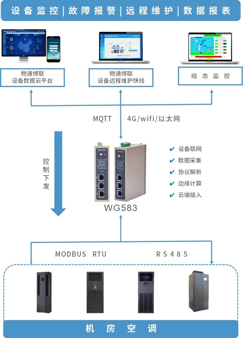 機(jī)房現(xiàn)場(chǎng)的恒溫加濕精密空調(diào)設(shè)備通過(guò)RS485串口連接到工業(yè)智能網(wǎng)關(guān)WG583,網(wǎng)關(guān)實(shí)時(shí)采集設(shè)備數(shù)據(jù)并通過(guò)4G/WIFI/以太網(wǎng)等方式上傳到IOT云平臺(tái)。通過(guò)IOT云平臺(tái),用戶可以隨時(shí)查看設(shè)備運(yùn)行狀態(tài)、技術(shù)參數(shù)、組態(tài)監(jiān)控畫(huà)面并遠(yuǎn)程控制設(shè)備啟停。當(dāng)設(shè)備異常或者故障時(shí),系統(tǒng)會(huì)自動(dòng)報(bào)警,并將故障報(bào)警信息自動(dòng)通過(guò)手機(jī)、郵件、微信等方式通知管理人員,管理人員能夠及時(shí)對(duì)設(shè)備進(jìn)行遠(yuǎn)程維護(hù)或者現(xiàn)場(chǎng)維護(hù),實(shí)現(xiàn)機(jī)房空調(diào)的智能管理控制,從而保證現(xiàn)場(chǎng)環(huán)境溫濕度的恒定安全。