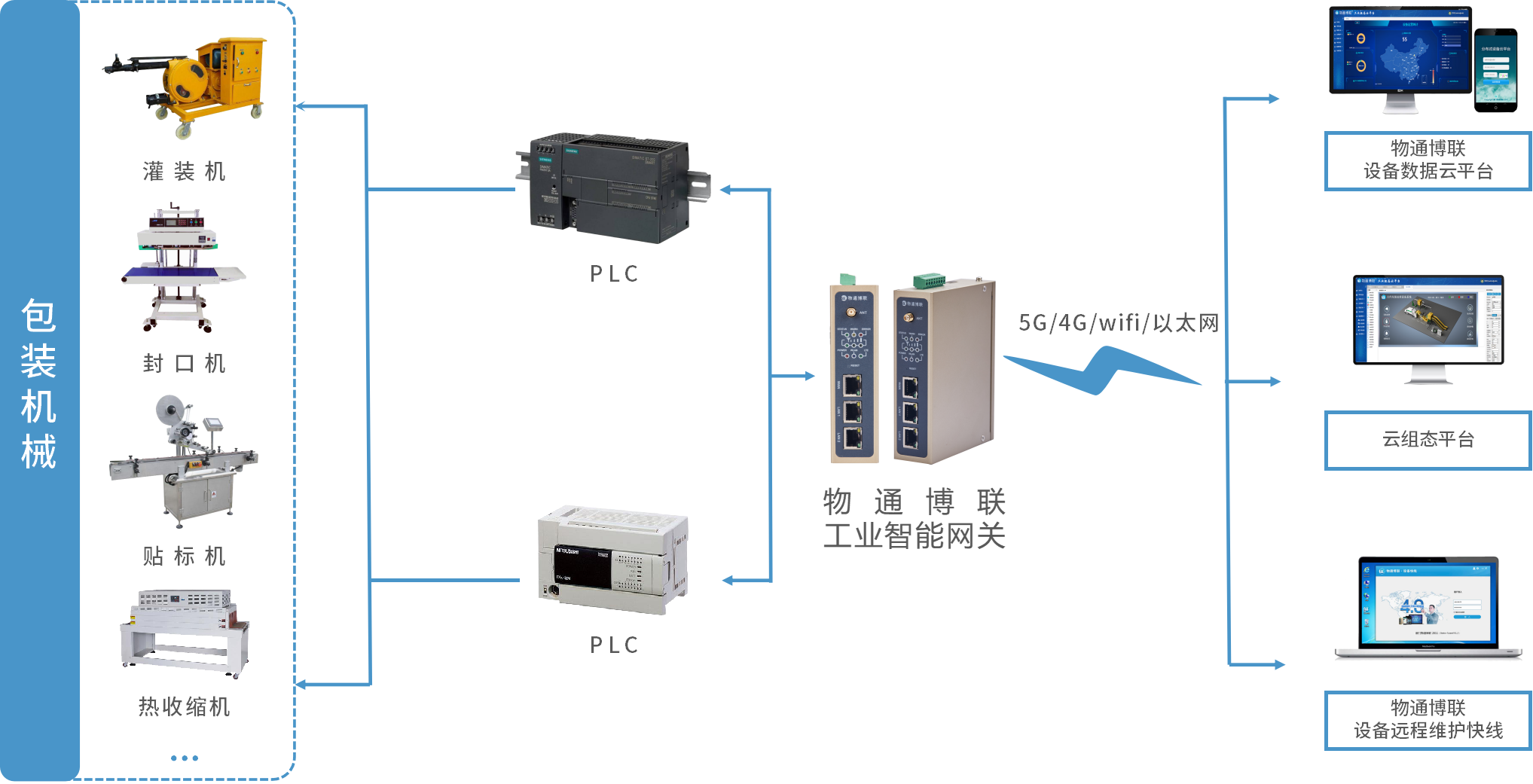物通博聯(lián)工業(yè)智能網(wǎng)關(guān)具有豐富的通信協(xié)議和接口,通過接入包裝機(jī)械設(shè)備的控制器PLC,就能實(shí)時(shí)采集包裝機(jī)械設(shè)備運(yùn)行狀態(tài)、溫度、壓力、振動(dòng)等參數(shù),通過5G、4G、WIFI、以太網(wǎng)等方式將數(shù)據(jù)上傳到云平臺(tái),實(shí)現(xiàn)遠(yuǎn)程監(jiān)控、組態(tài)監(jiān)控、設(shè)備管理、故障報(bào)警、遠(yuǎn)程控制、遠(yuǎn)程維護(hù)、數(shù)據(jù)分析等功能,全面掌握設(shè)備的運(yùn)行情況,幫助企業(yè)提升包裝機(jī)械設(shè)備運(yùn)維與管理水平,保障安全穩(wěn)定生產(chǎn),提高生產(chǎn)效率。