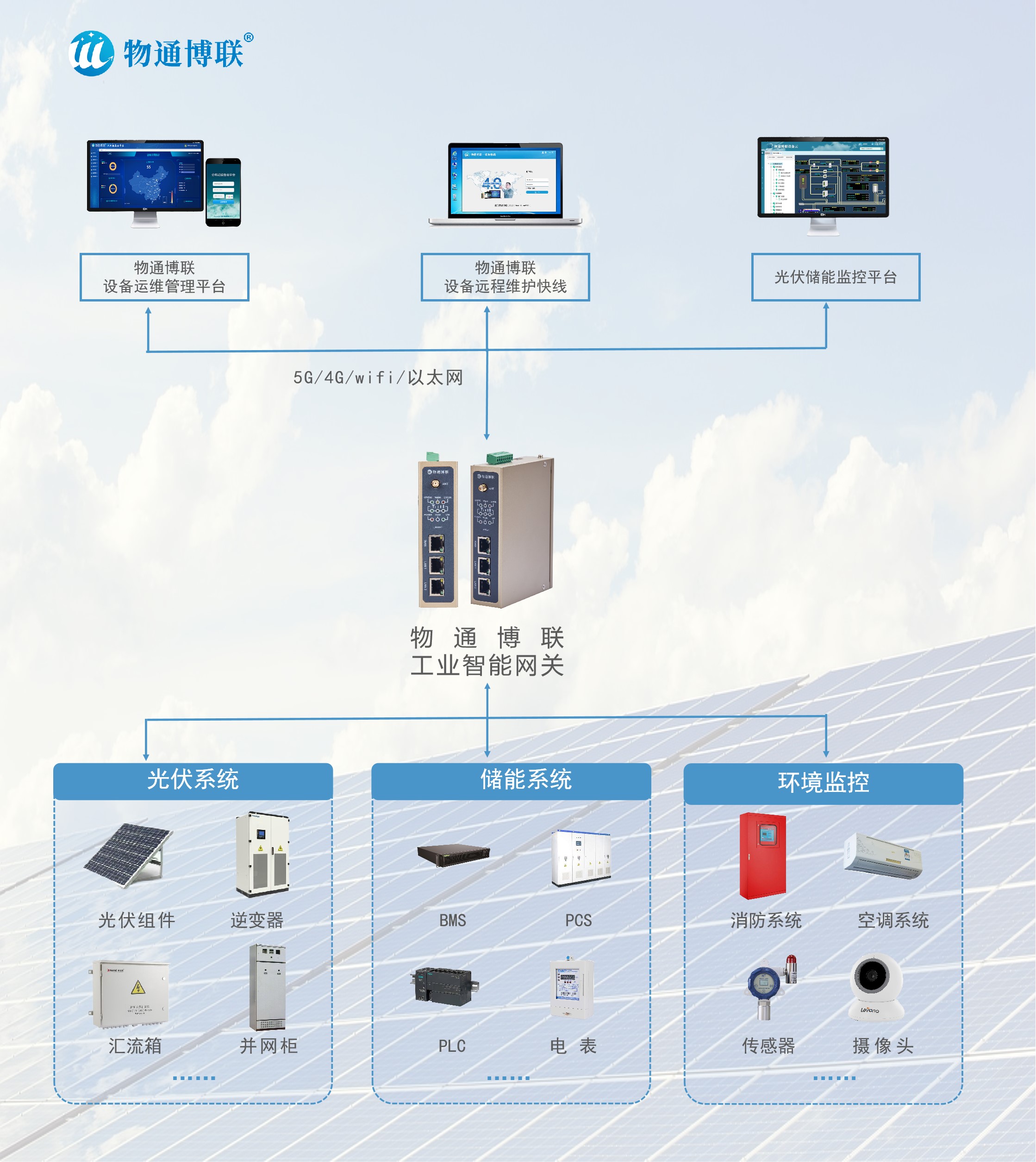 物通博聯(lián)工業(yè)智能網(wǎng)關采集PLC、傳感器、電表、BMS、PCS、儲能設備、逆變器、斷路器、匯流箱、并網(wǎng)柜、消防系統(tǒng)、空調系統(tǒng)等設備數(shù)據(jù)到監(jiān)控平臺,對電站的電壓、電流、功率、溫濕度、太陽輻照度、發(fā)電量、電池容量等數(shù)據(jù)進行實時監(jiān)測,通過手機電腦等終端監(jiān)控光伏儲能電站的實時工作狀態(tài)和環(huán)境情況。