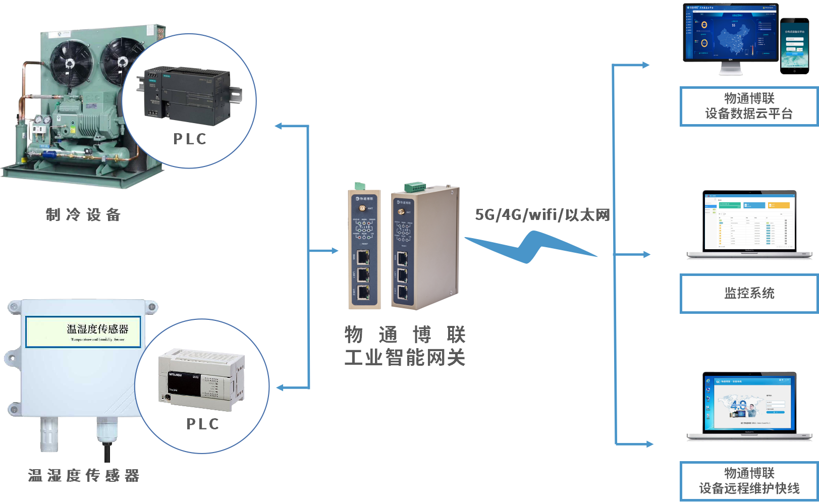 無論是食品冷鏈中的生產(chǎn)、運(yùn)輸還是存儲環(huán)節(jié),需要監(jiān)測的設(shè)備都是制冷設(shè)備與傳感器。通過將物通博聯(lián)工業(yè)智能網(wǎng)關(guān)接入制冷設(shè)備PLC與溫濕度傳感器,網(wǎng)關(guān)就能實(shí)時采集溫濕度、壓力及電壓、電流等數(shù)據(jù),并通過5G/4G/WIFI/以太網(wǎng)等網(wǎng)絡(luò)將數(shù)據(jù)傳輸?shù)皆贫吮O(jiān)控平臺。