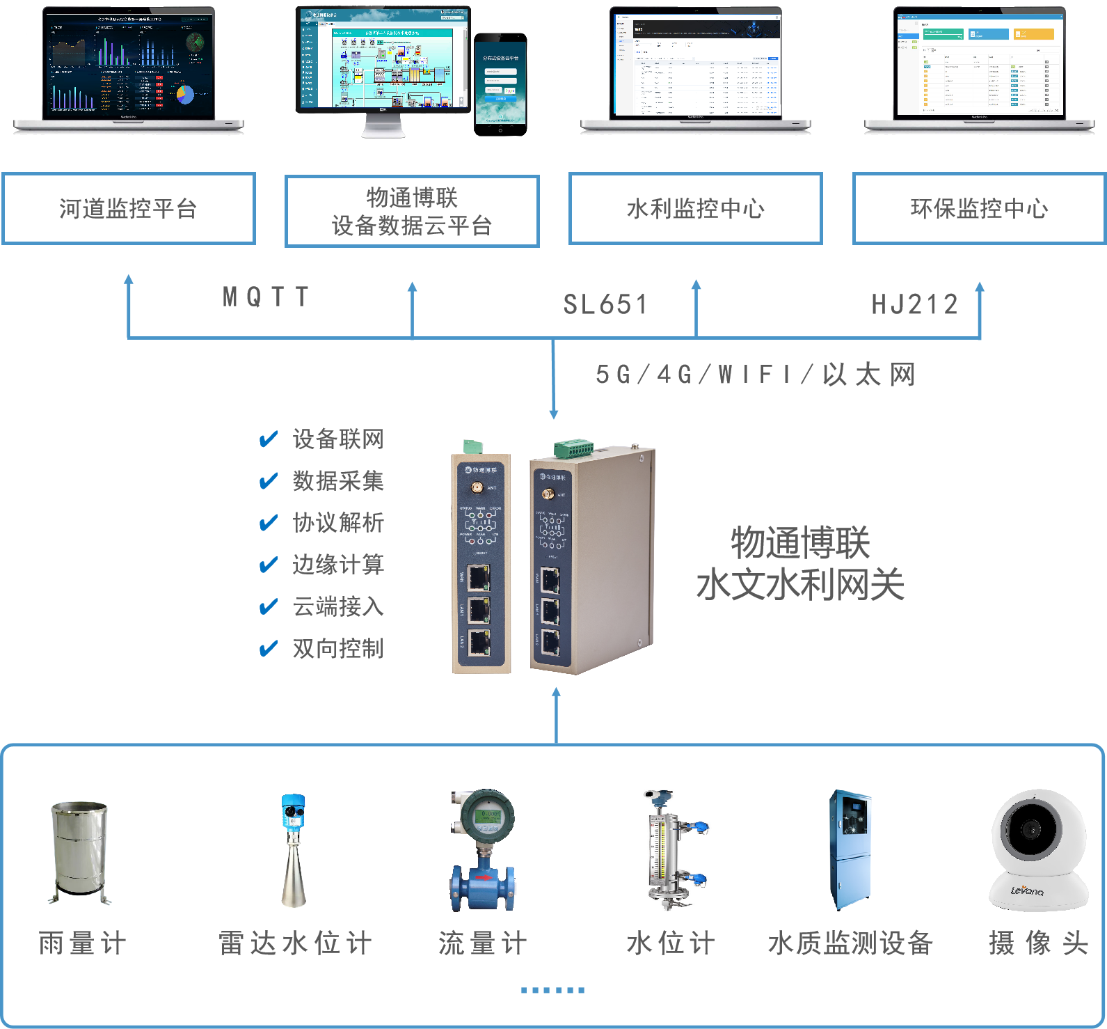 通過將物通博聯(lián)水文水利網(wǎng)關部署到河流河道中的水文監(jiān)測站中,實時采集流量計、流速儀、雨量計、水位計、水質監(jiān)測儀、攝像頭等設備數(shù)據(jù)并通過無線網(wǎng)絡上傳到管理部門平臺(支持MQTT協(xié)議、SL651協(xié)議、HJ212協(xié)議等),實現(xiàn)河流河道內水質、流量、水位等參數(shù)的實時監(jiān)測與可視化展示,為管理部門提供遠程監(jiān)控、超限預警、數(shù)據(jù)分析等功能,從而更好的支持河流河道的開發(fā)與保護工作。